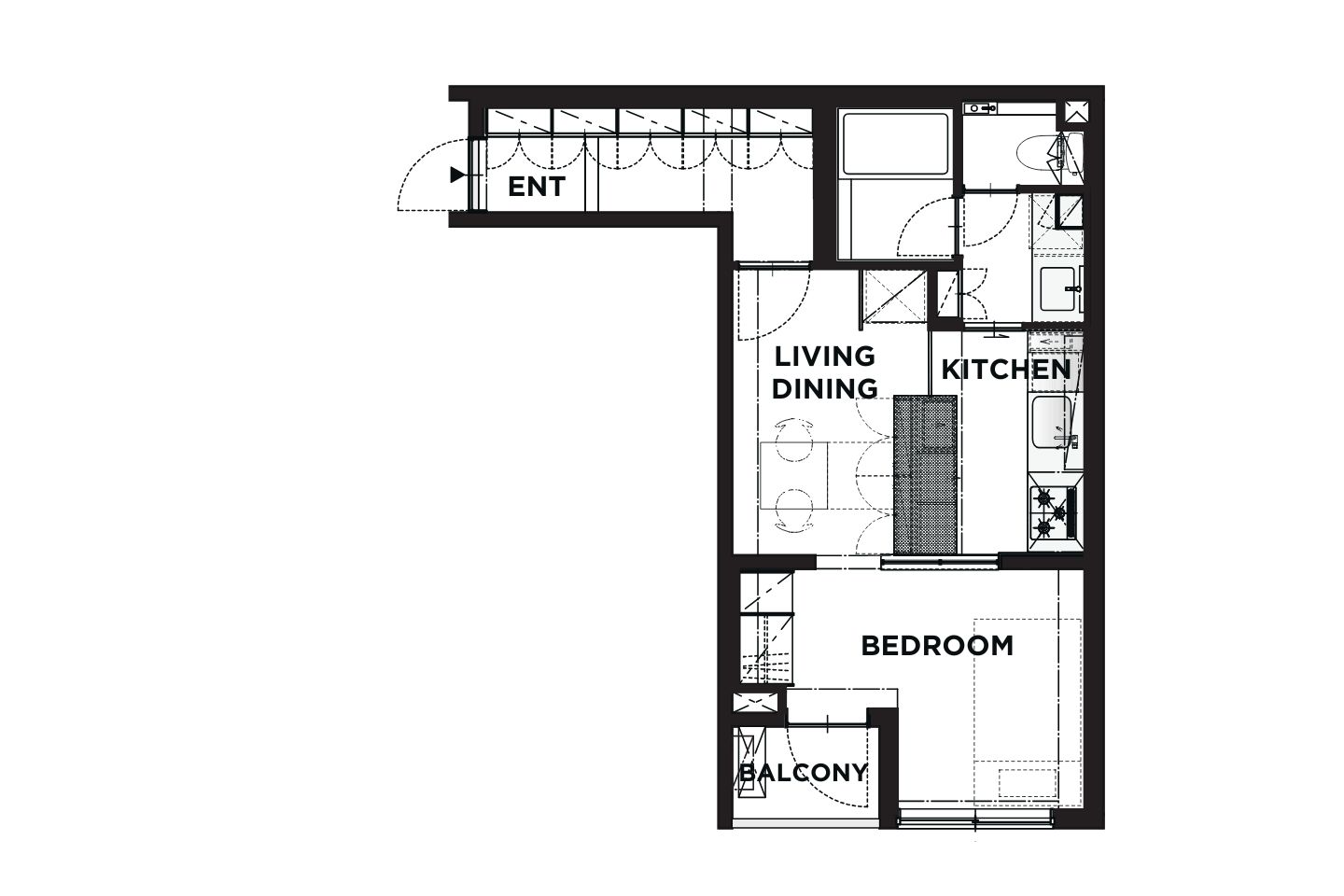 コンパクトなキッチンは幅を広げ、ダイニングキッチンの中央には大きなアイランドカウンターを作りました。