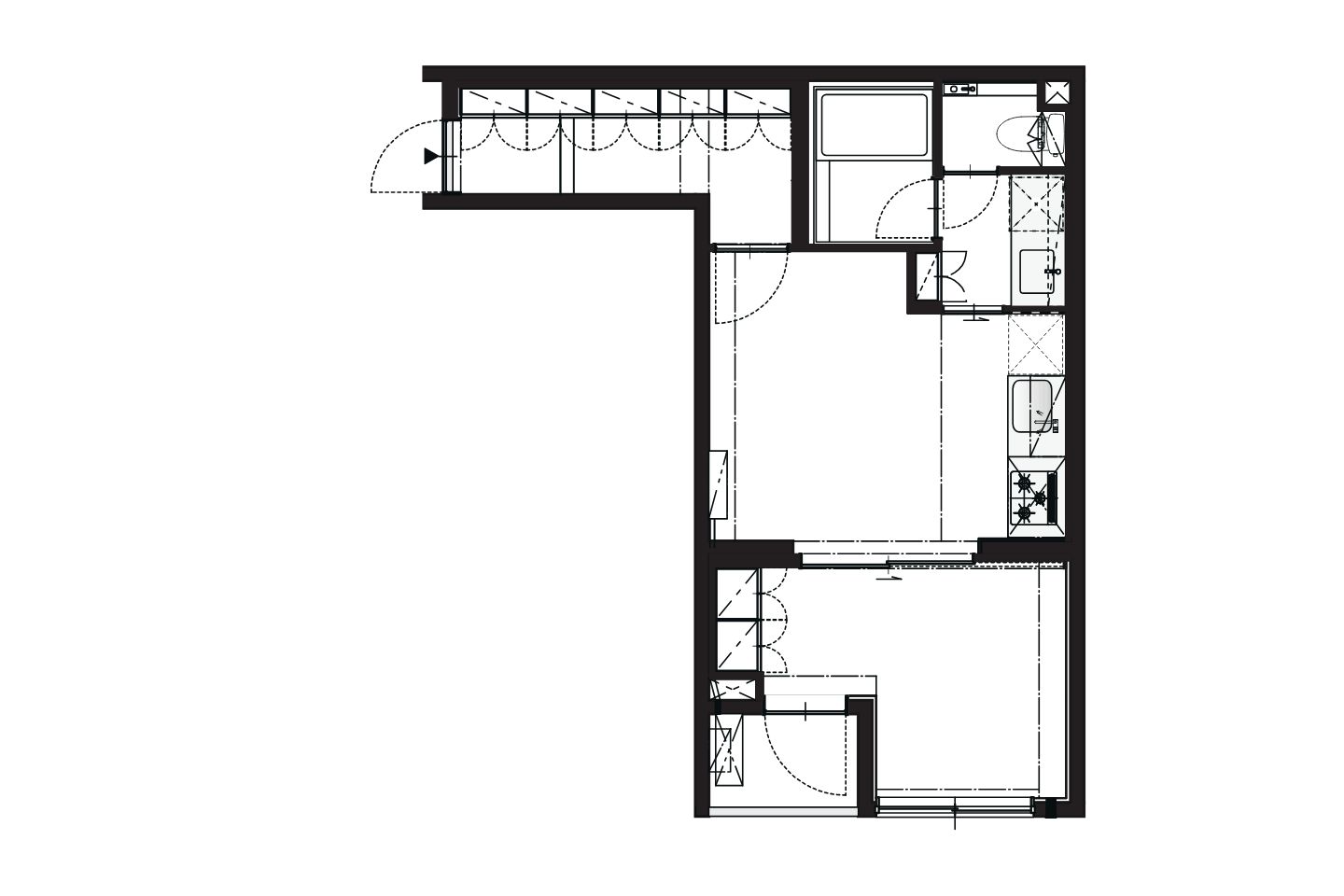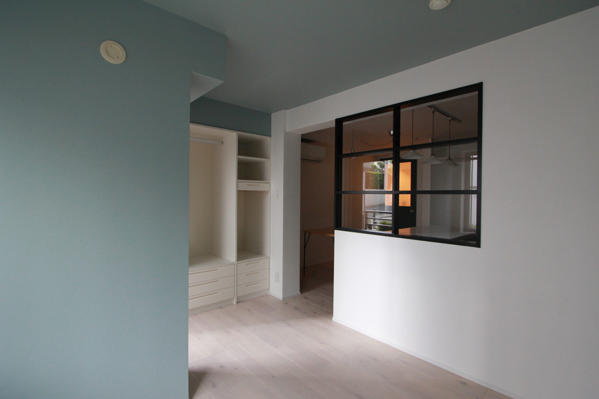 ベットルームとダイニングキッチンとの間には室内窓を設けました。