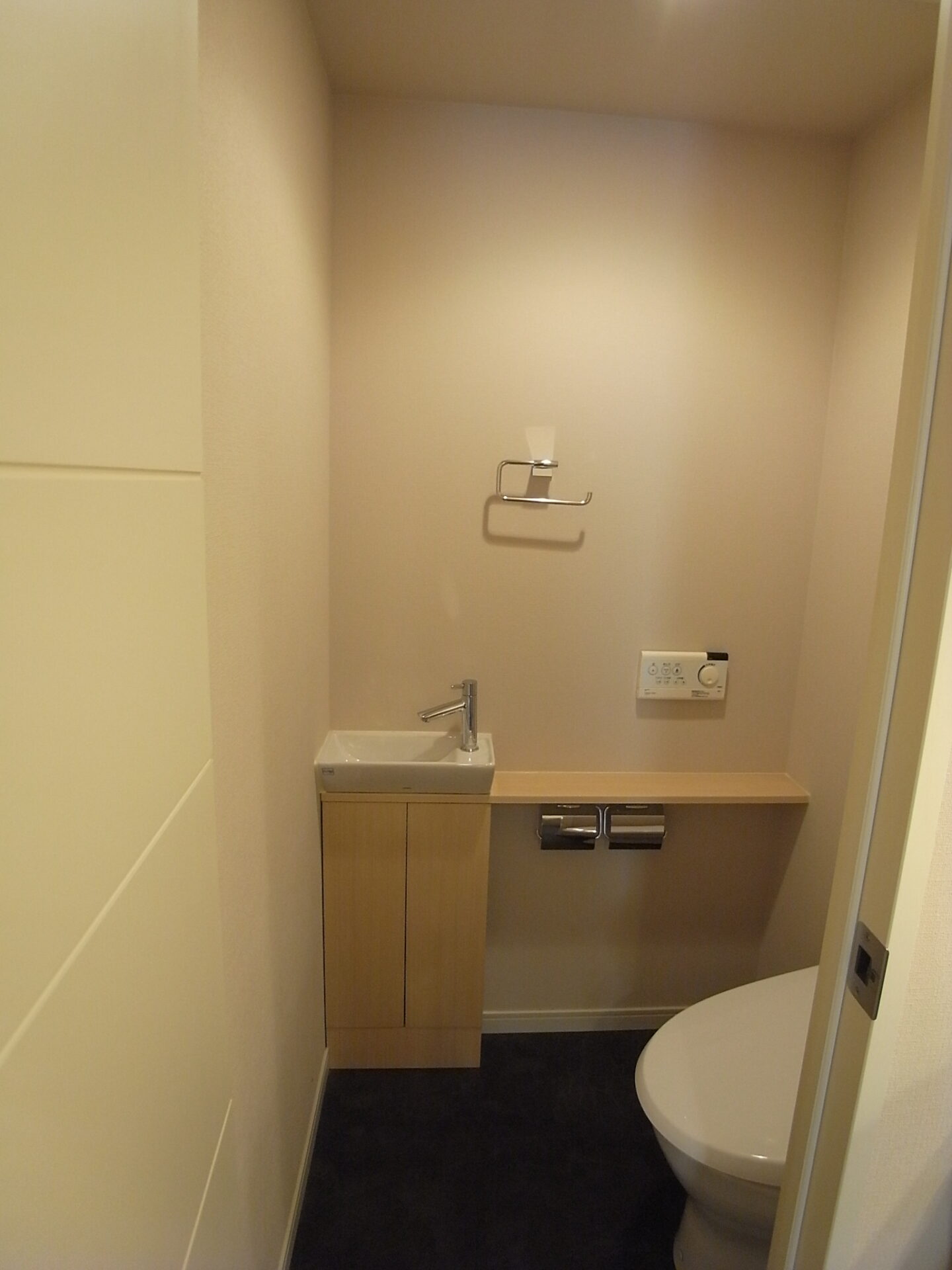 トイレ内の手洗いカウンターも既存を生かしながら、古材の足場板を取り入れ、上品ながら味わいのある空間に仕上がりました。