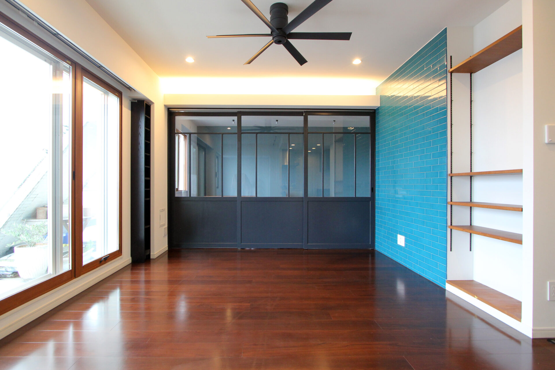 リビングは鮮やかなエメラルドグリーンのタイルをアクセントに、間接照明とシーリングファンを設置してシックな空間に仕上げました。