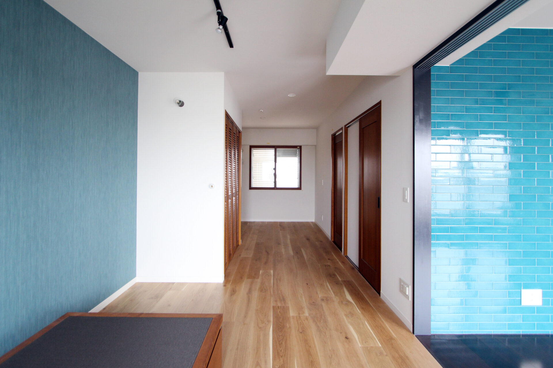つながるワークスペースとエメラルドグリーンのタイル壁【神奈川県相模原市 マンション リノベーション】