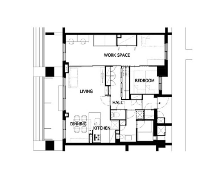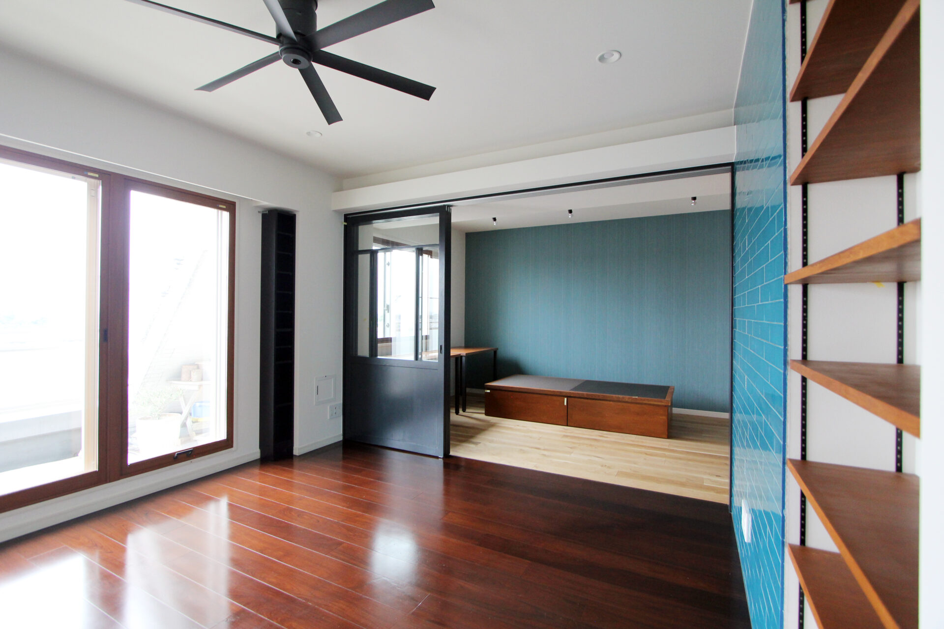 リビングの奥にあった和室と隣の寝室の間の壁を取り払い、お子様の成長に合わせてレイアウトを変えられる広いワークスペースをつくりました。
