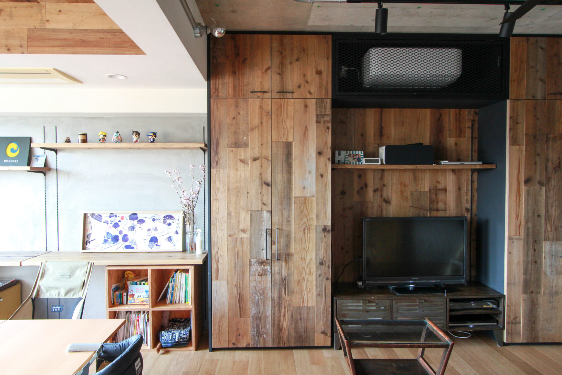 手持ちのインダストリアルなテレビボードに合わせて、足場板で大きな壁面収納を造作。