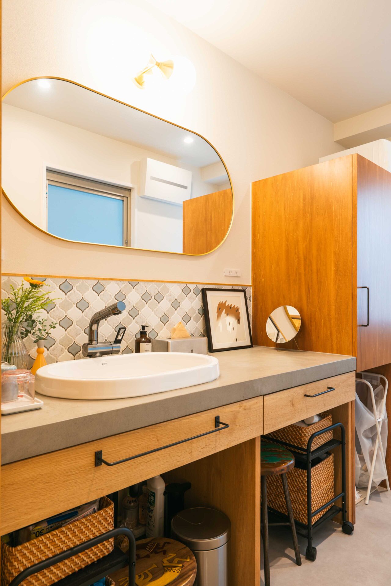 洗面室は淡い色のコラベルというモザイクタイルにゴールドの縁のミラーを。上品さと共に清潔感のある仕上がりになりました。