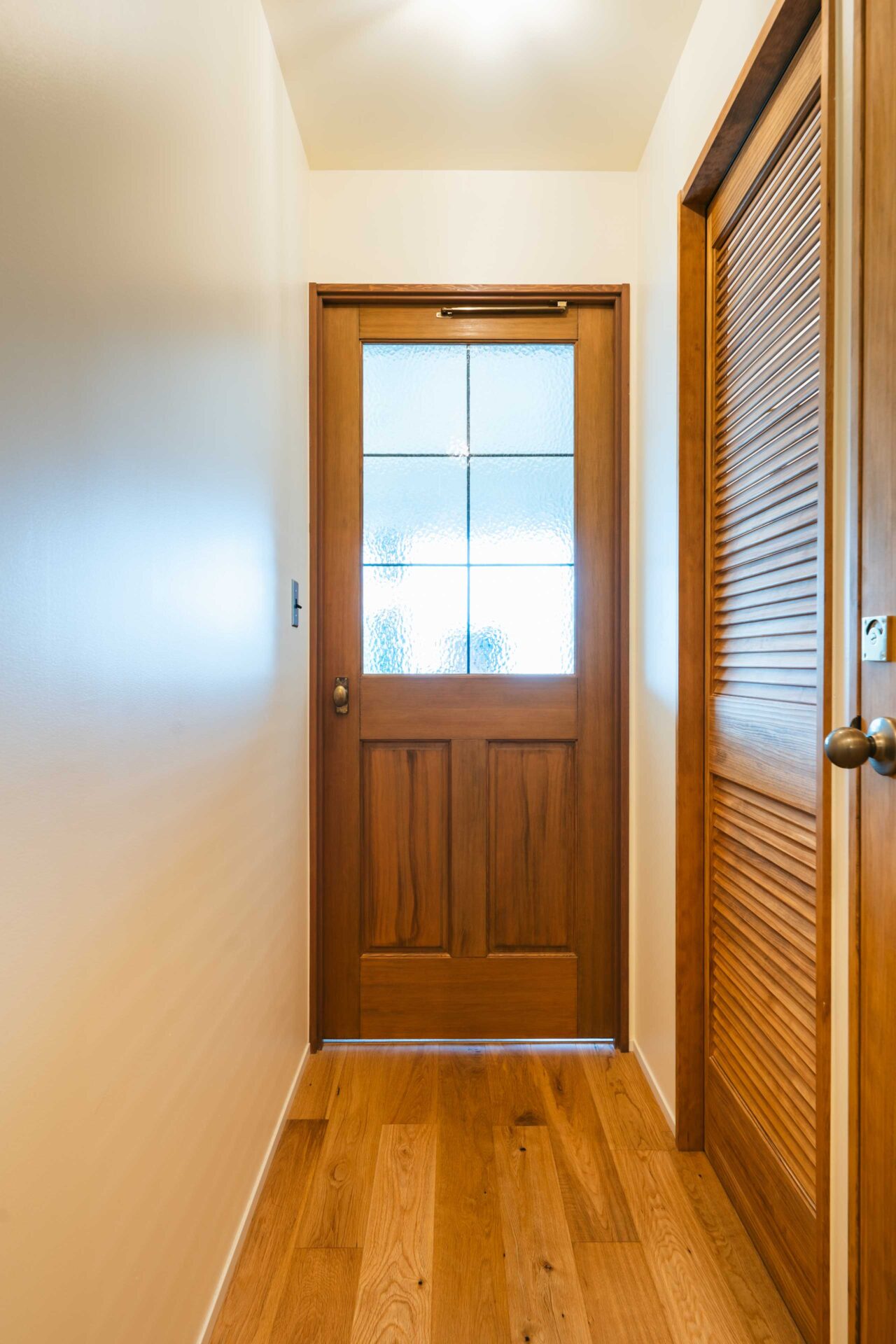 リビングの扉はアンティークガラスにアイアンの格子が入っており、真鍮の取っ手がヴィンテージ感を醸し出しています。