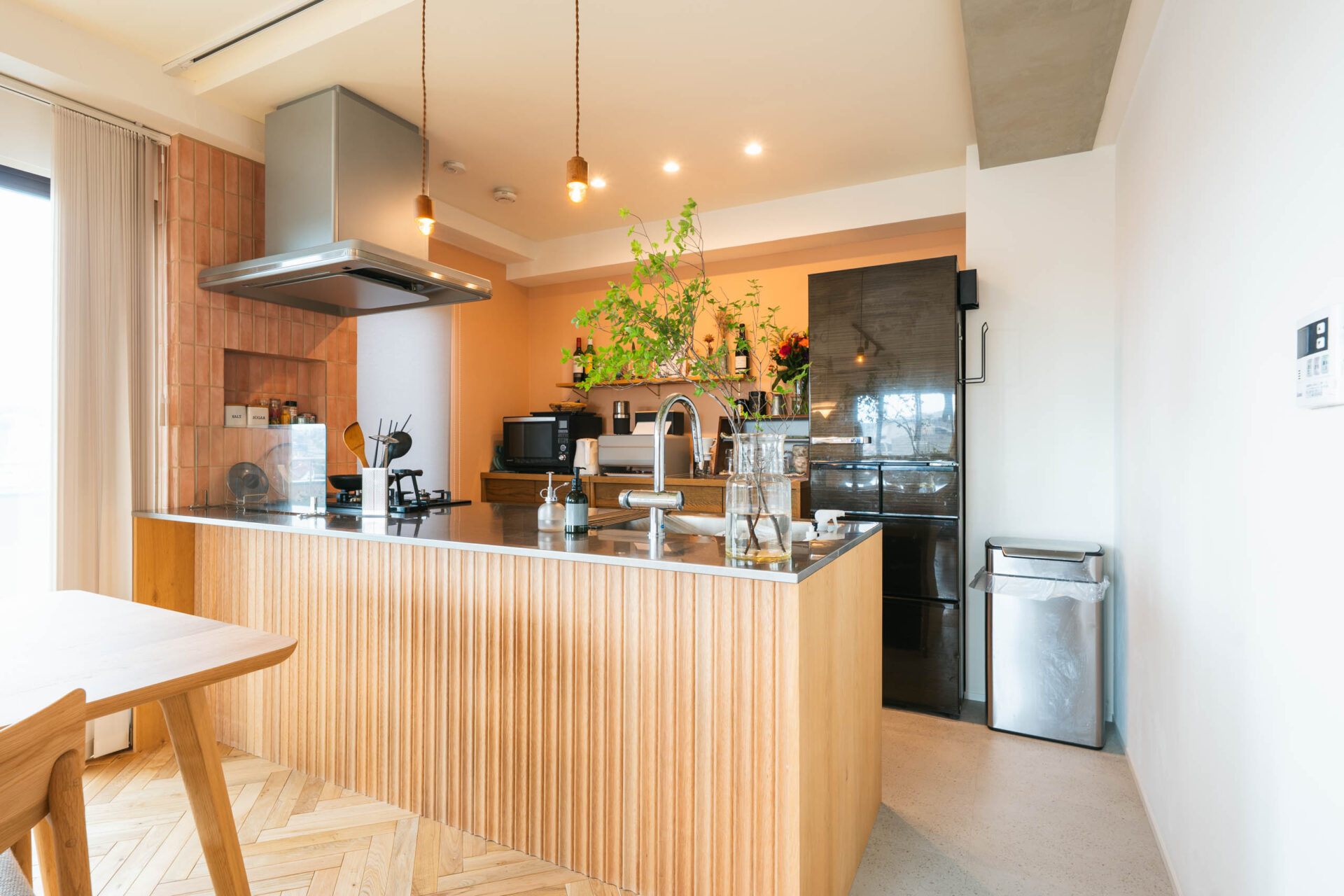キッチンのリビング向きの腰壁をリブパネル貼りにすることで、床のヘリンボーンとの相性も良くなり、高級感も増します。