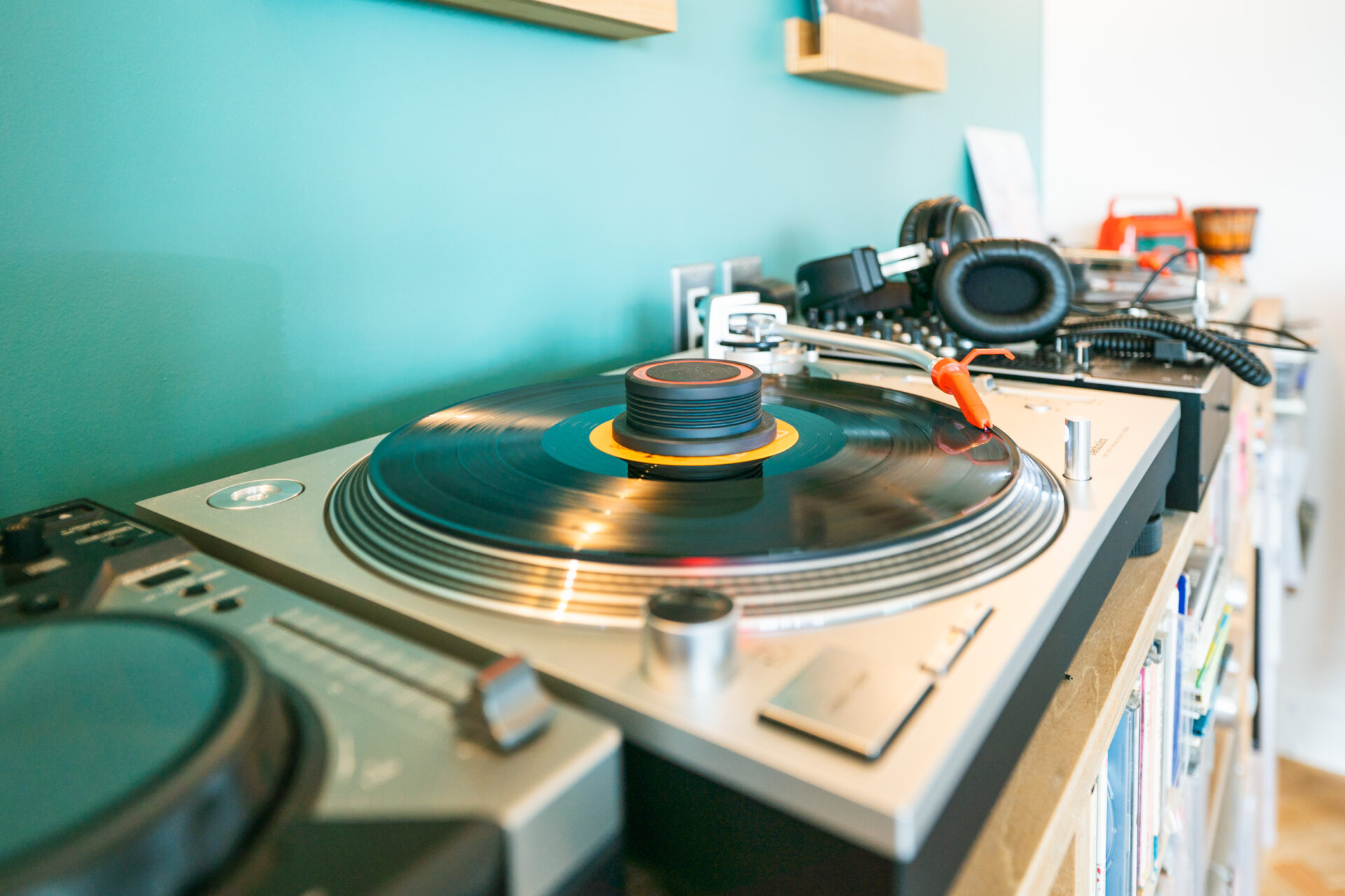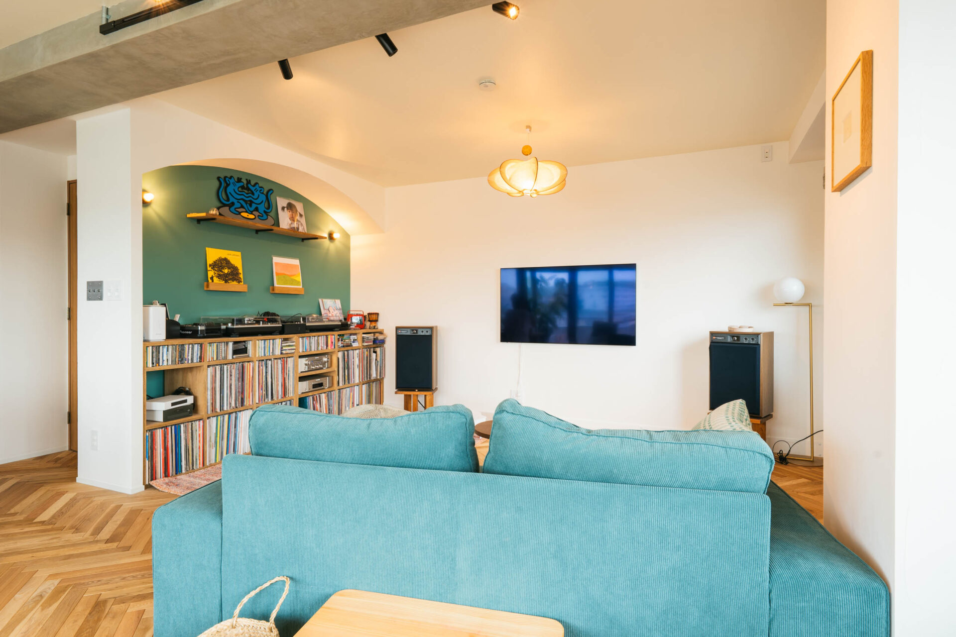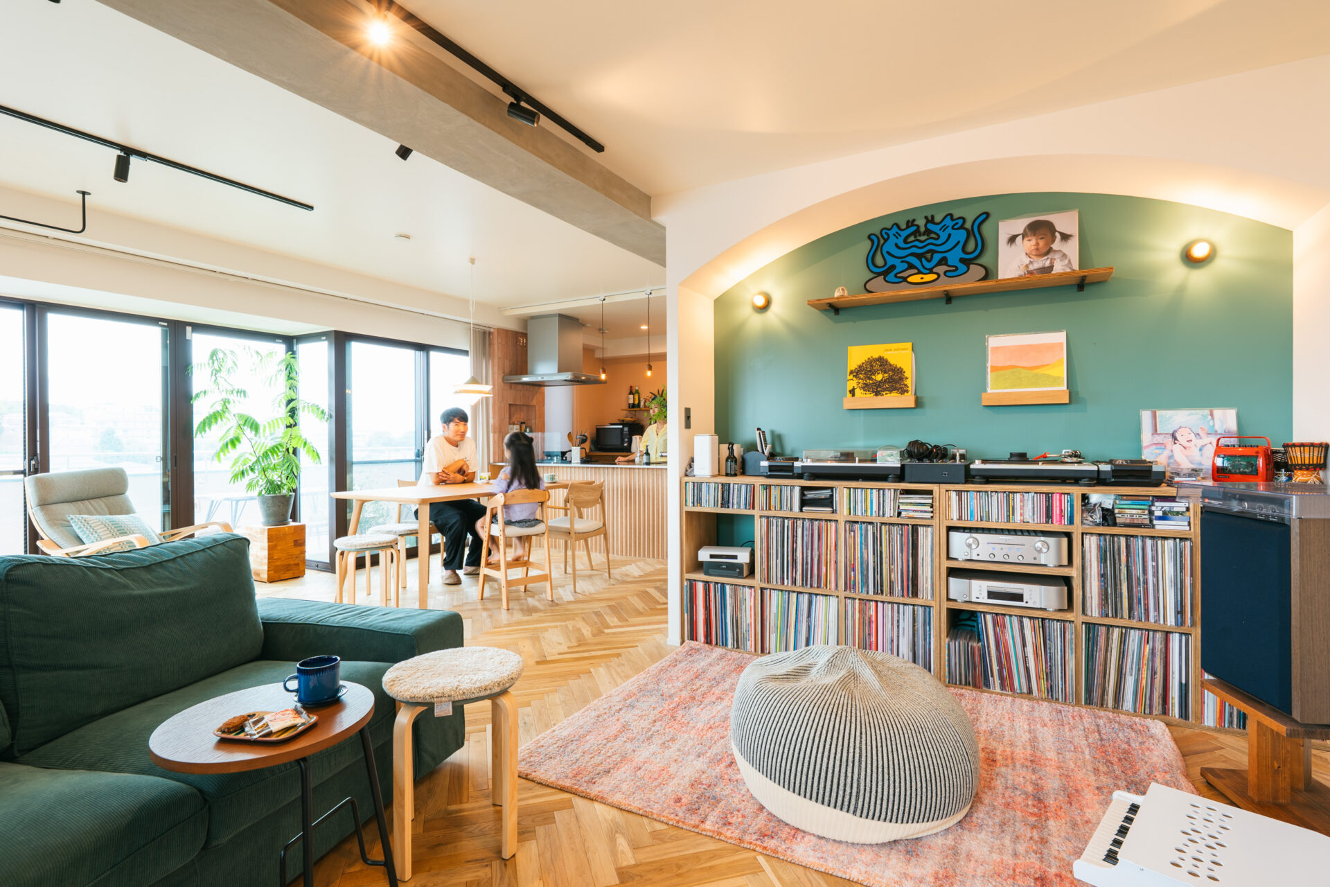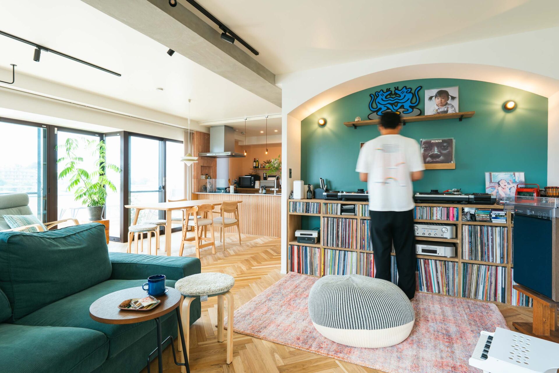 リビングの一角には、ご主人の趣味のレコードを収納したり飾るためのDJスペースを造作しました。テーマは「レコード&アートギャラリーカフェ」。配線を見えないように工夫もされています。