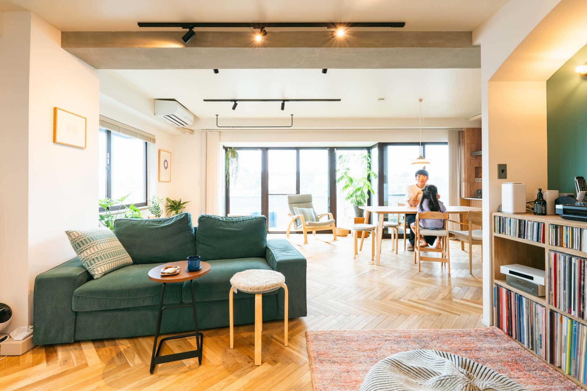 グリーンでコーディネートされている広々としたリビングスペース。ヘリンボーンのフローリングが家具を引き立てます。