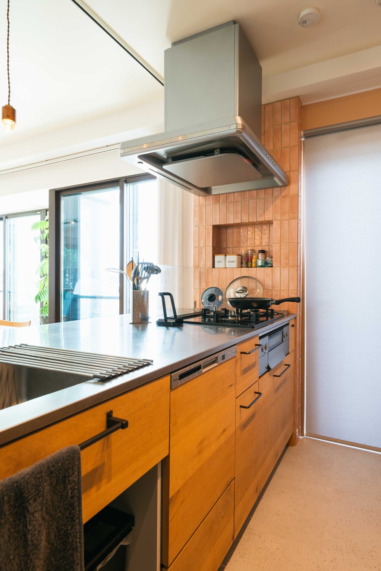 キッチンの天板は傷の目立ちにくい少しマット感のあるステンレスのバイブレーション仕上げというものを採用。木製扉のオリジナルキッチンです。壁タイルは壁面に合わせてピンク色のタイルに。