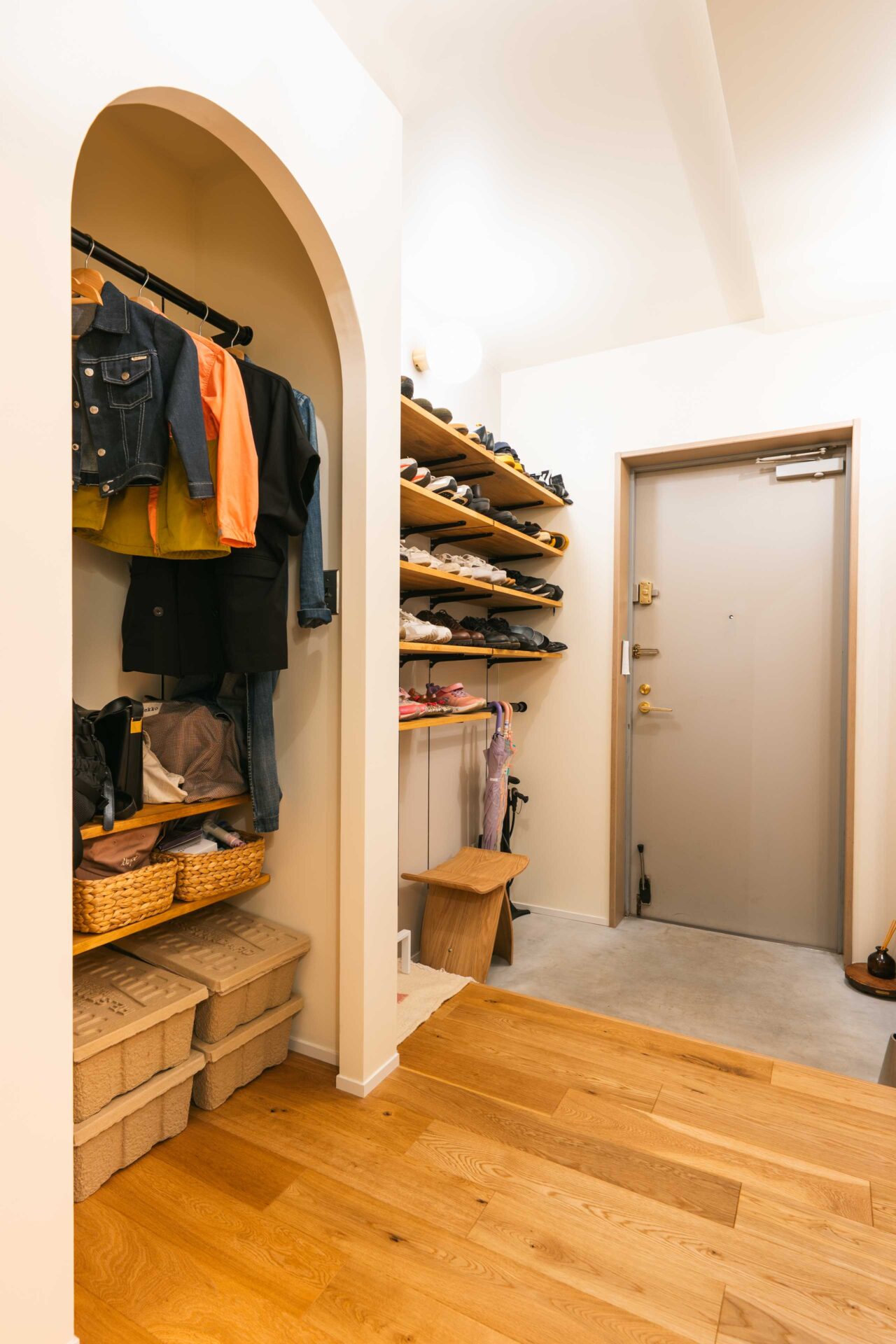 玄関横にはアクセントとなるアーチ開口のコート掛け。内部収納棚は可動式になっていて使い勝手に合わせてカスタム可能。