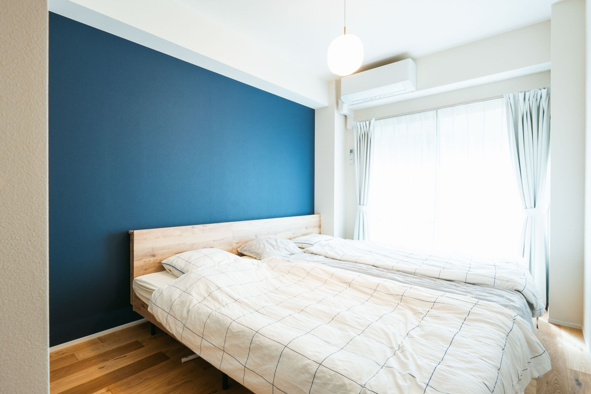 寝室のアクセントウォールは心を落ちつかせる深い青色をセレクトしています。