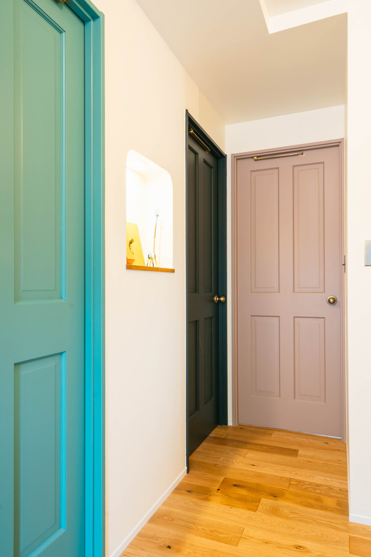 各個室の部屋の扉はそれぞれのお部屋のイメージカラーに合わせて色を変えています。