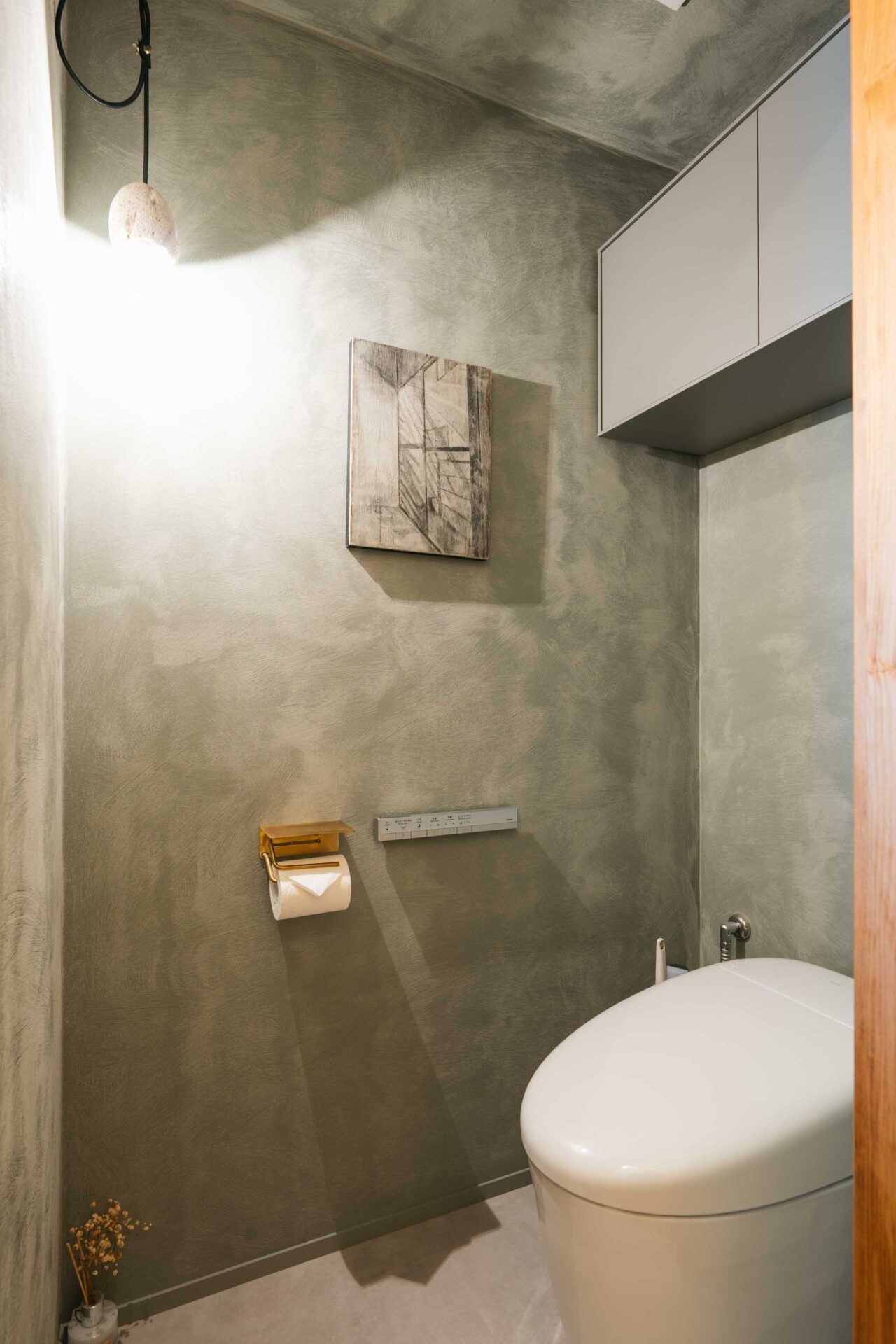 トイレの壁はテクスチャーペイントで立体的な質感や模様を使っています。ご主人セレクトの照明器具と絵も素敵にコーディネートされています。