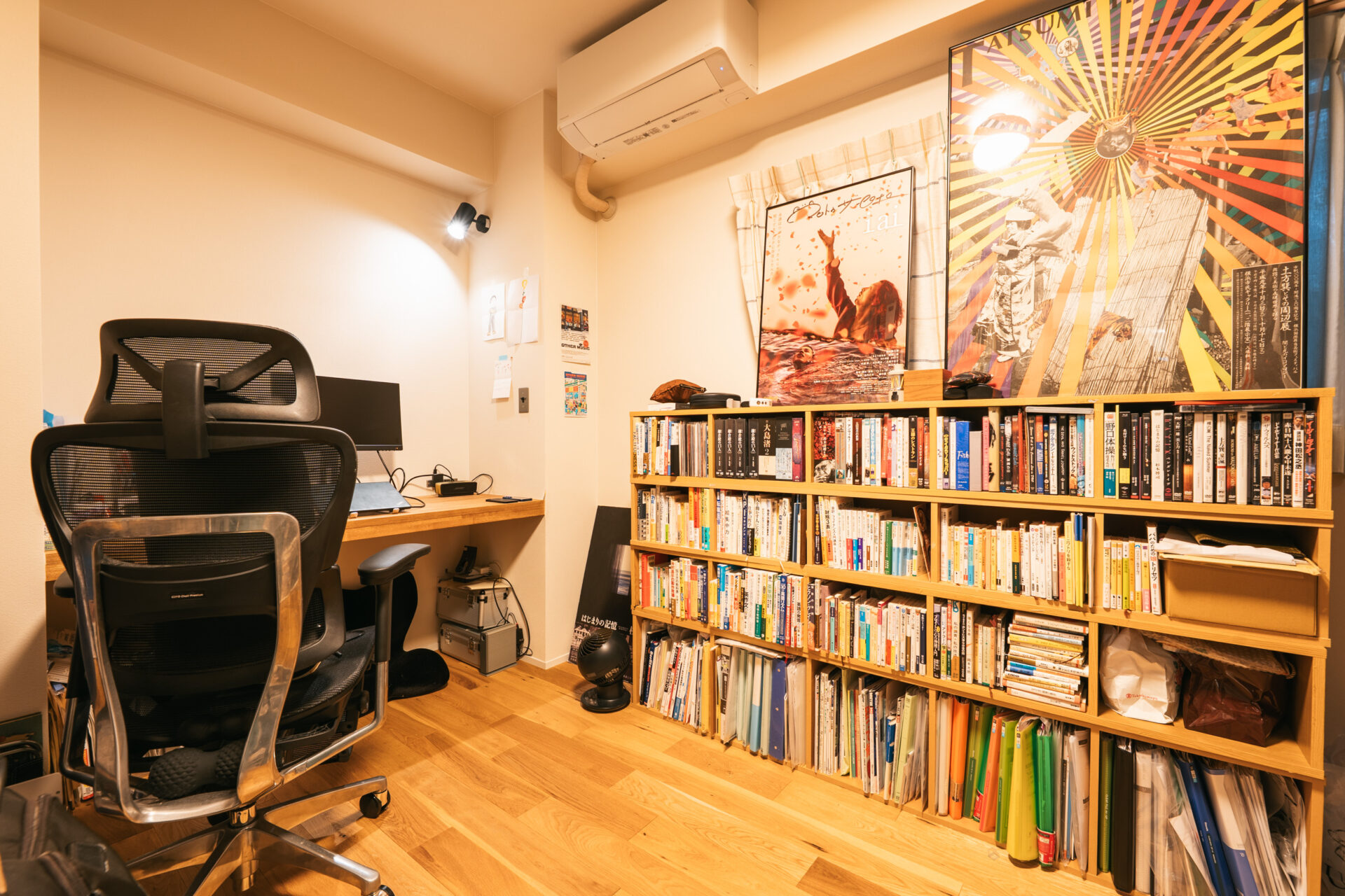 本や洋服など好きなものに囲まれたご主人の部屋。デスクも作り付けになっています。